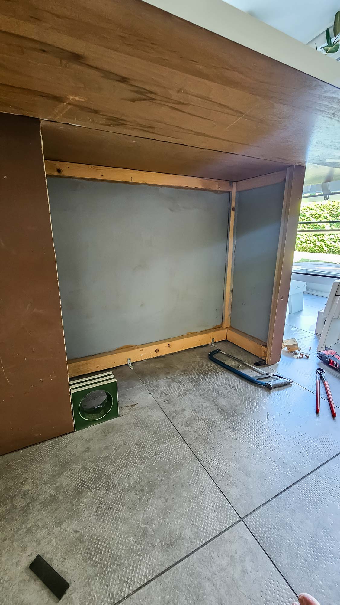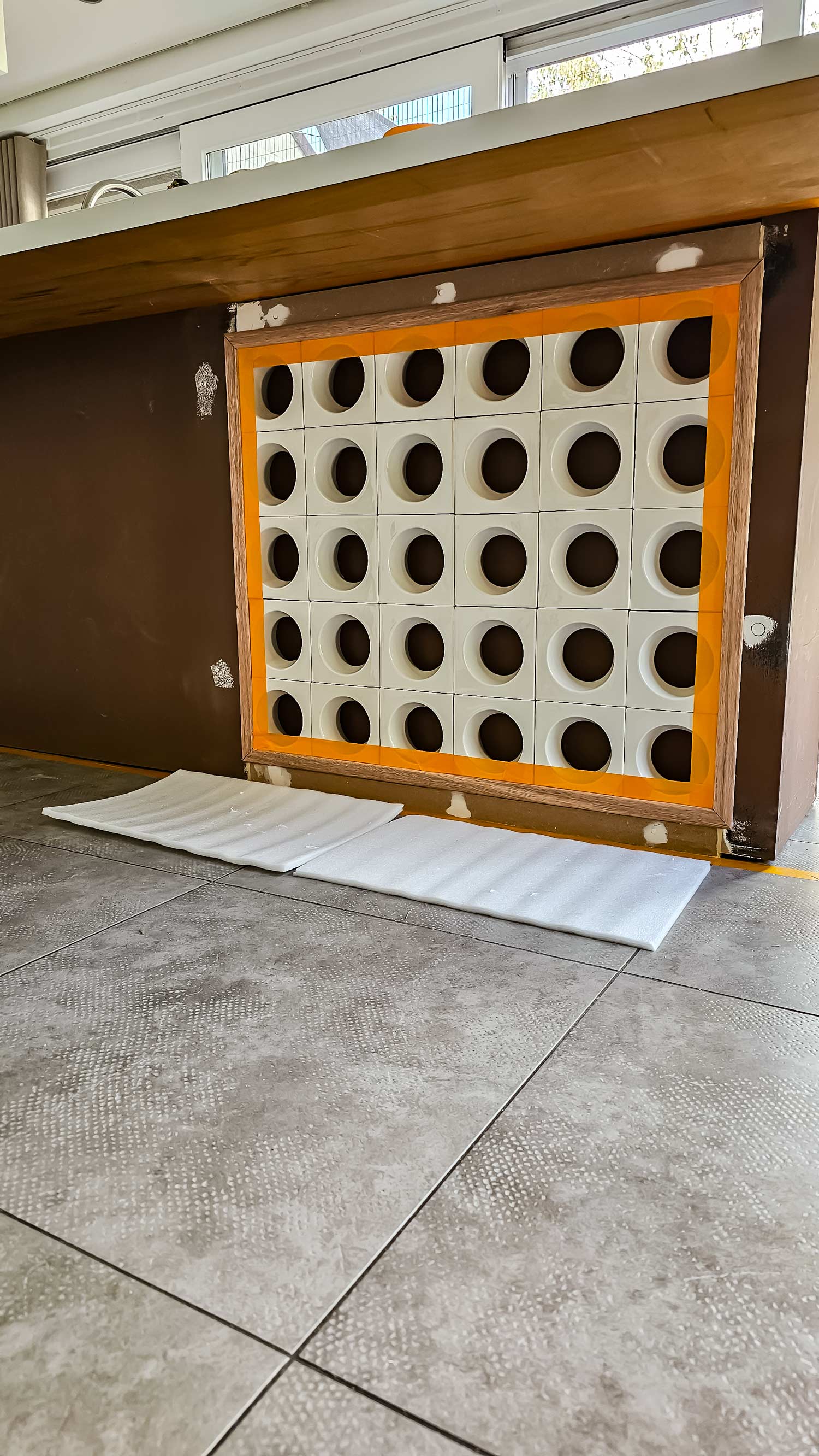 Omdat we in een bestaande situatie werkten, moesten we eerst een uitsparing maken in de keukenbar zodat de Cobogó-stenen ertussen geplaatst konden worden.