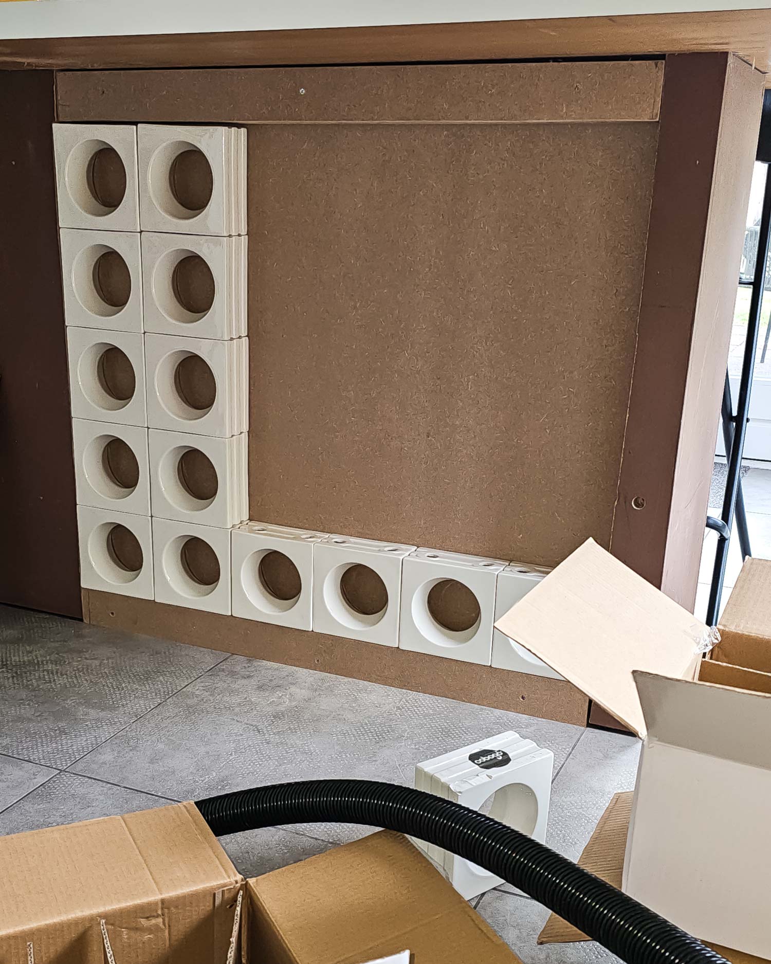 En dan nu het leukste deel van dit project: het plaatsen van de Cobogó-stenen. Omdat alles al is uitgemeten en we ongeveer weten waar elke steen moet komen, is dit zo gebeurd!