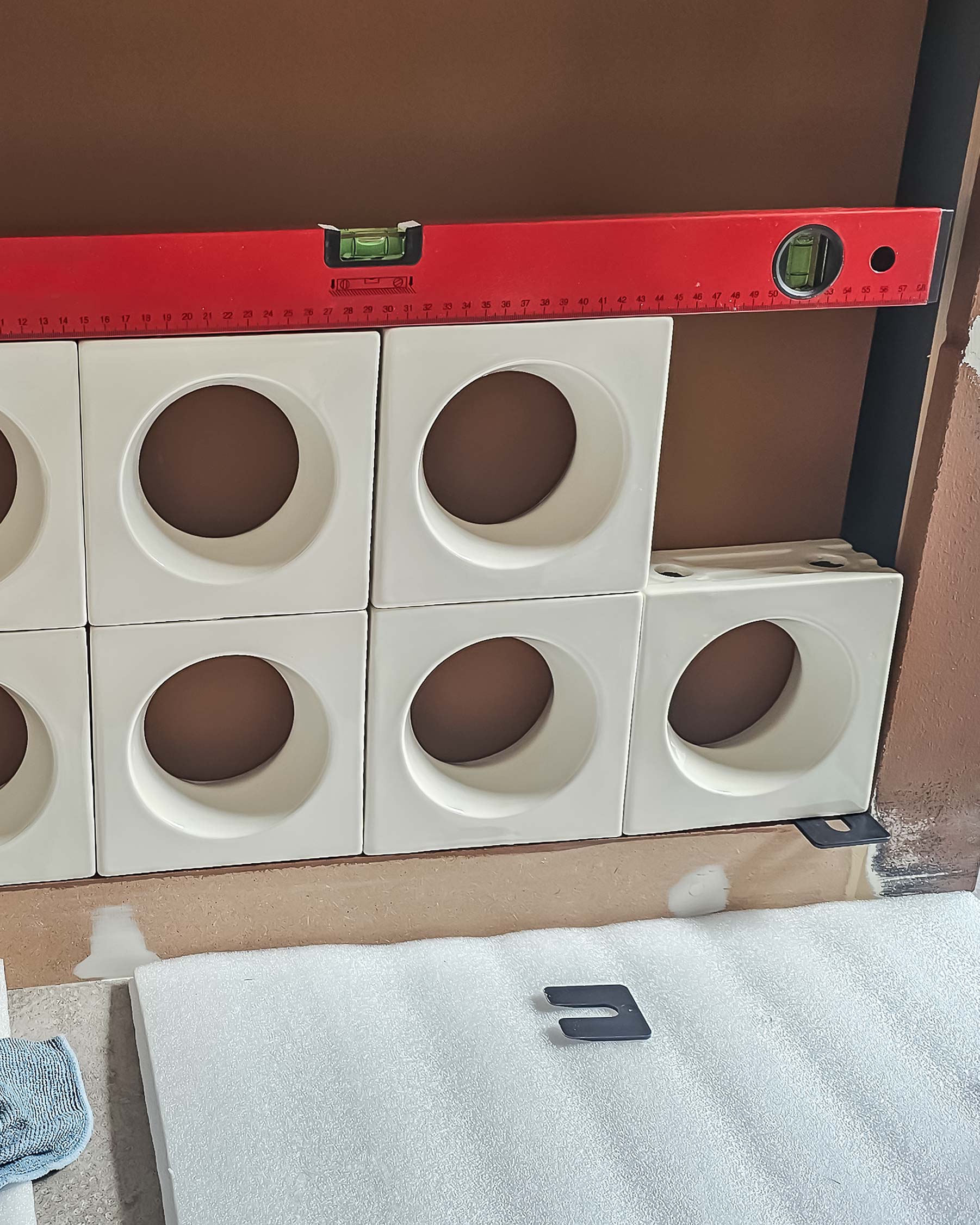 Vul de nis rustig verder met Cobogó-blokken en zorg dat elke laag zorgvuldig wordt uitgelijnd.