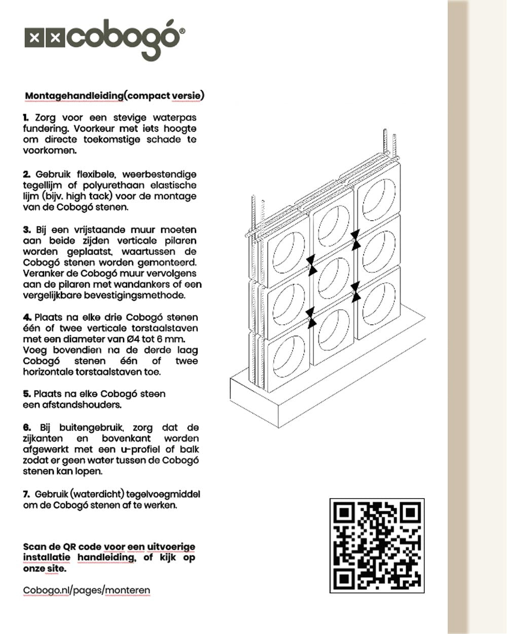 Cobogó stenen dienen decoratief te worden toegepast en zijn niet ontworpen als dragend element. Ze zijn bedoeld als sier-of scheidsmuur en bieden geen structurele ondersteuning zoals betonblokken of metselstenen.